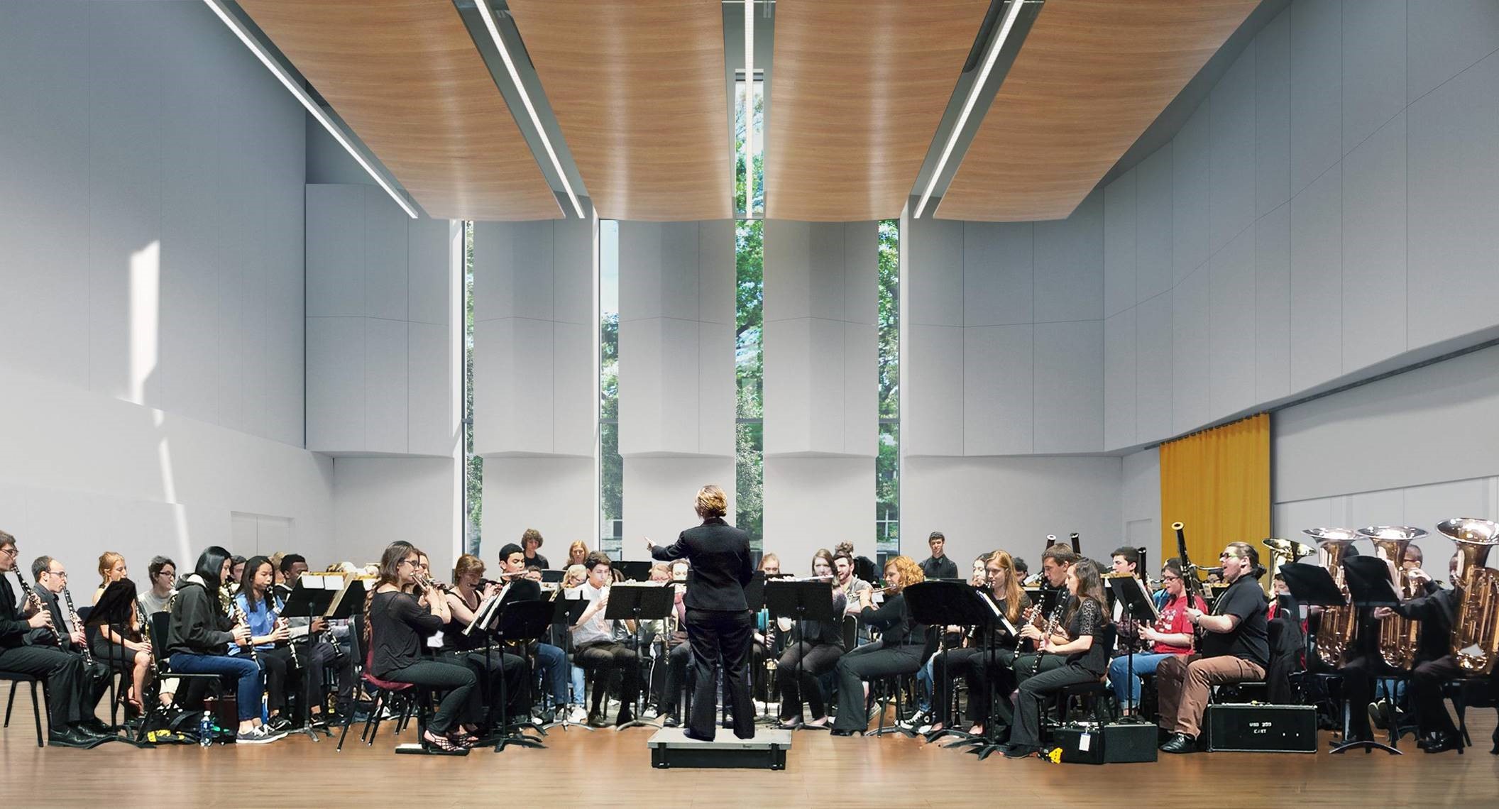 - Large instrumental rehearsal room for band, orchestra, percussion, jazz band, and new music ensembles